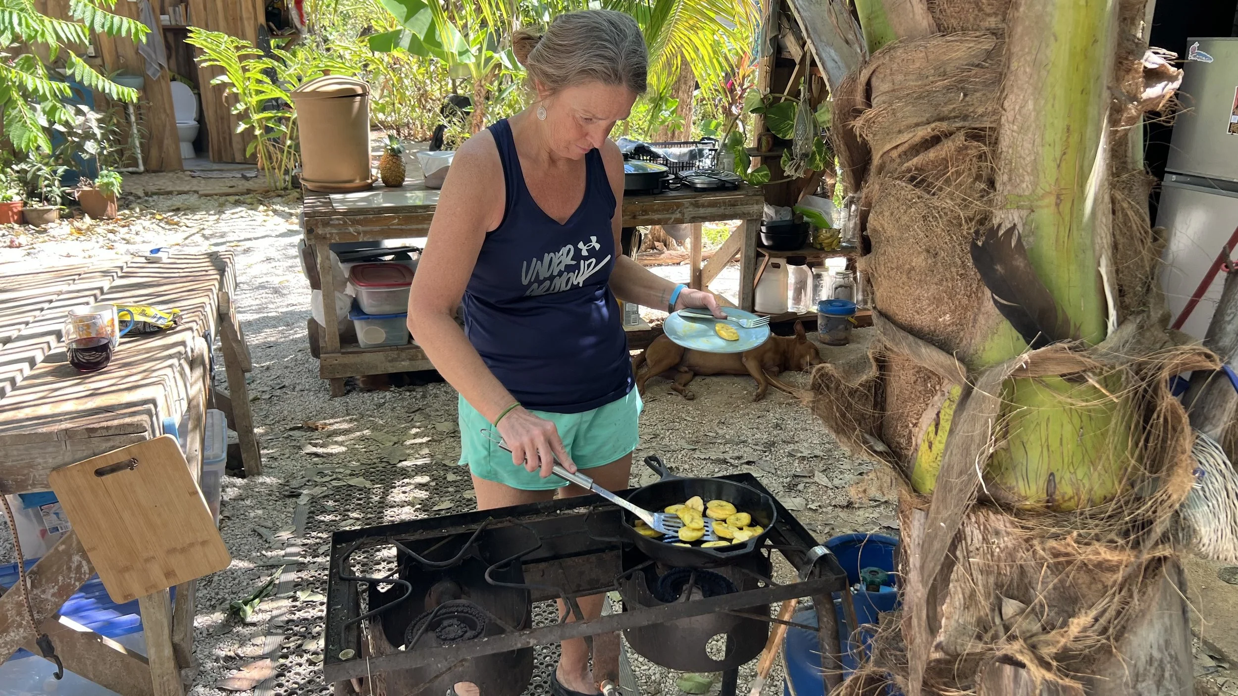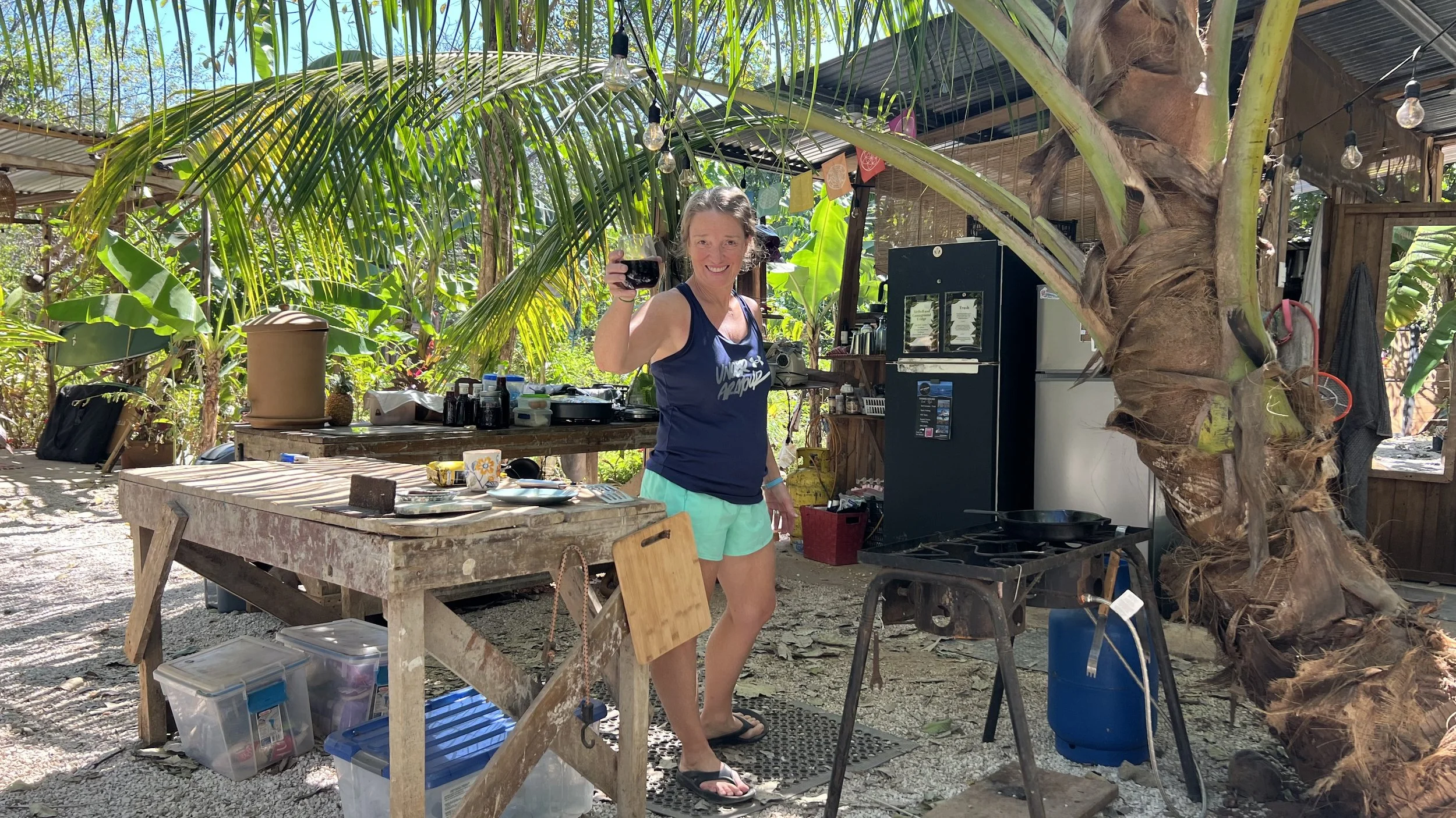 This is Shannon in the camp’s outdoor kitchen (the only kitchen here) offering up a glass of jamaica, pronounced ha-MIKE-uh (and not to be confused with the island nation of Jamaica 🇯🇲) that she just brewed. It’s a kind of tea, brewed from hibiscus leaves and this one has some added tamarind roots and ginger. A very nice cold drink for a hot day (which is pretty much every day here).
