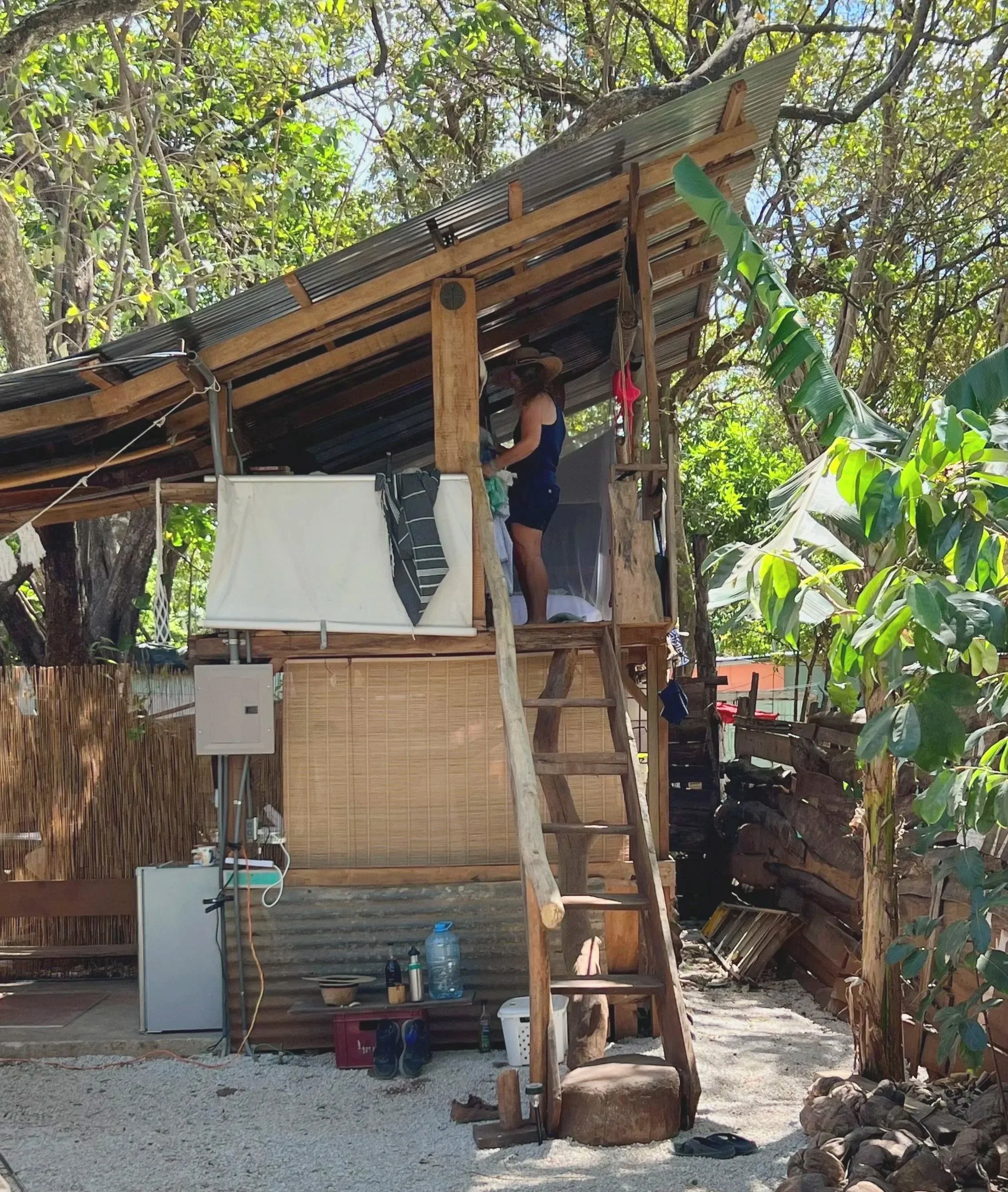 Our AirBnB “home” for these four weeks was a “jungle treehouse.” It wasn’t really built in a tree, but it was up off the ground and it had no walls. Just open air construction with roll-up straw blinds and mosquito netting the only things between us and the roar of the ocean.